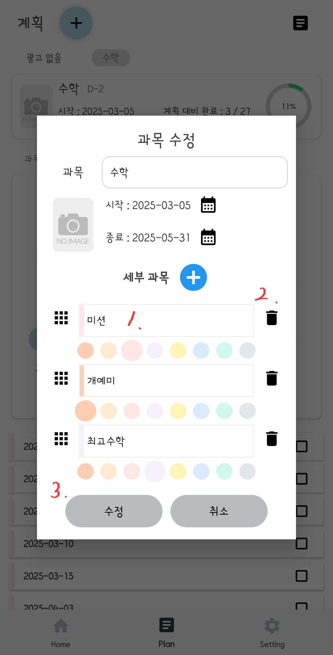Plan 탭 선택 > 과목명 클릭 >