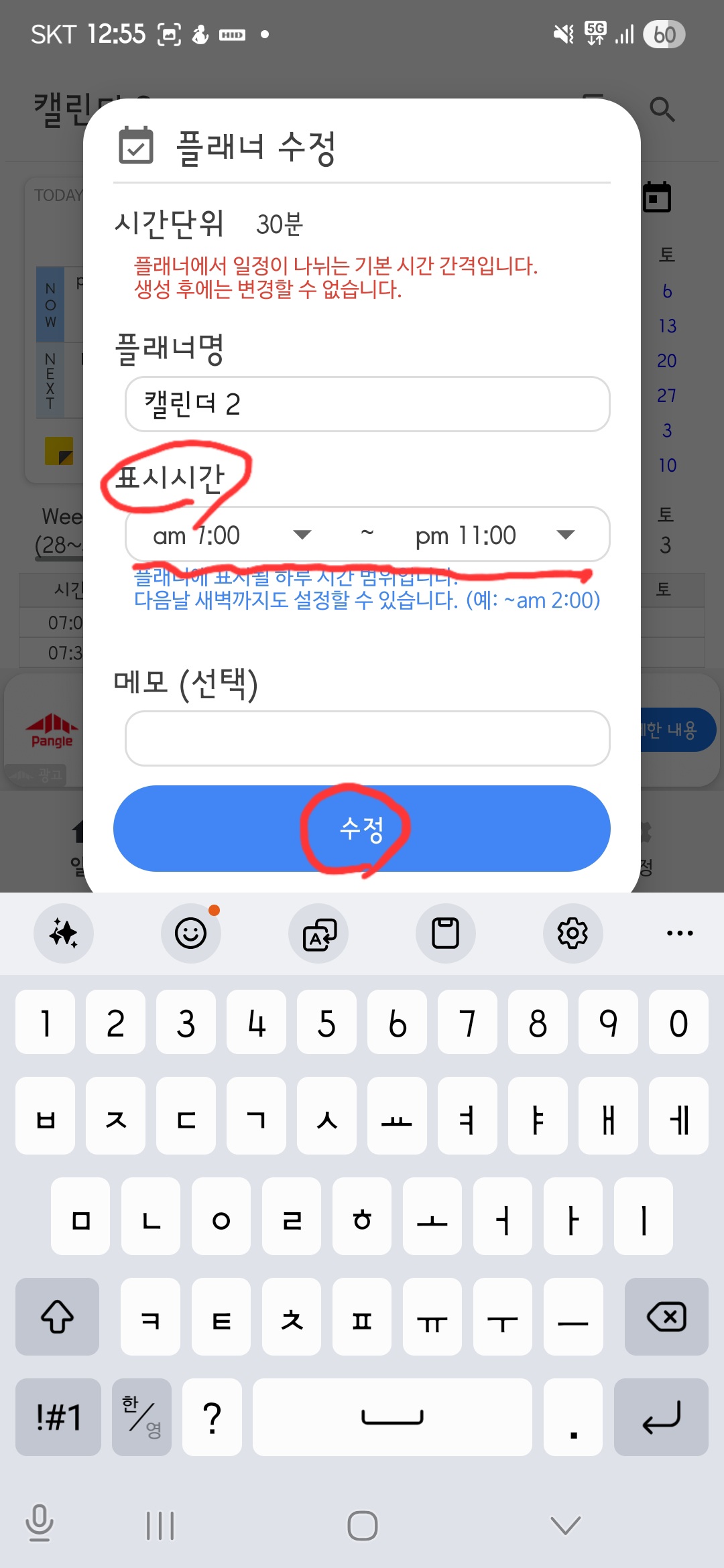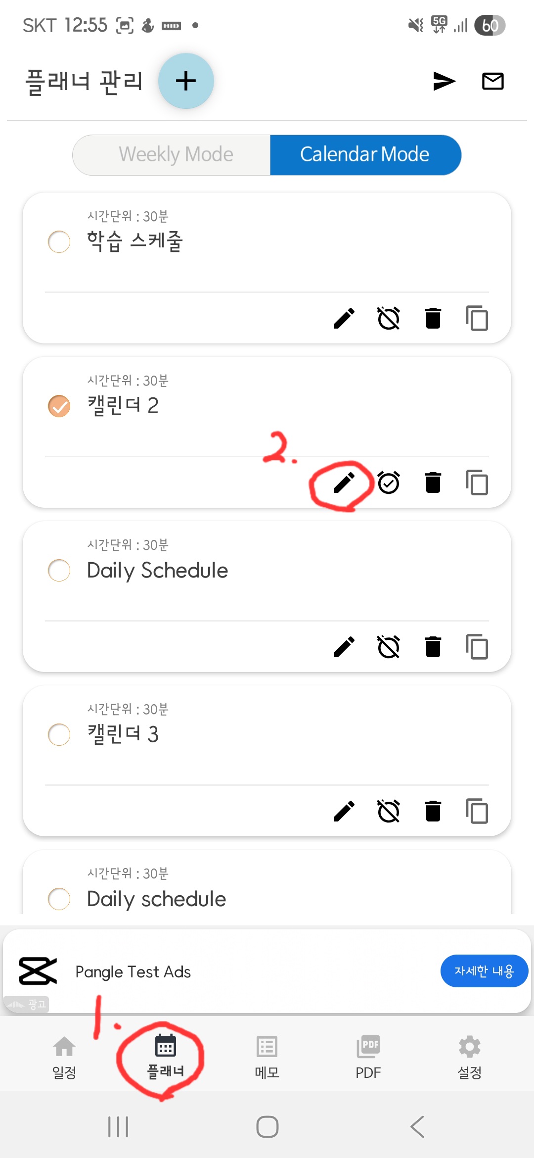 플래너 탭 > 연필(수정) 버튼